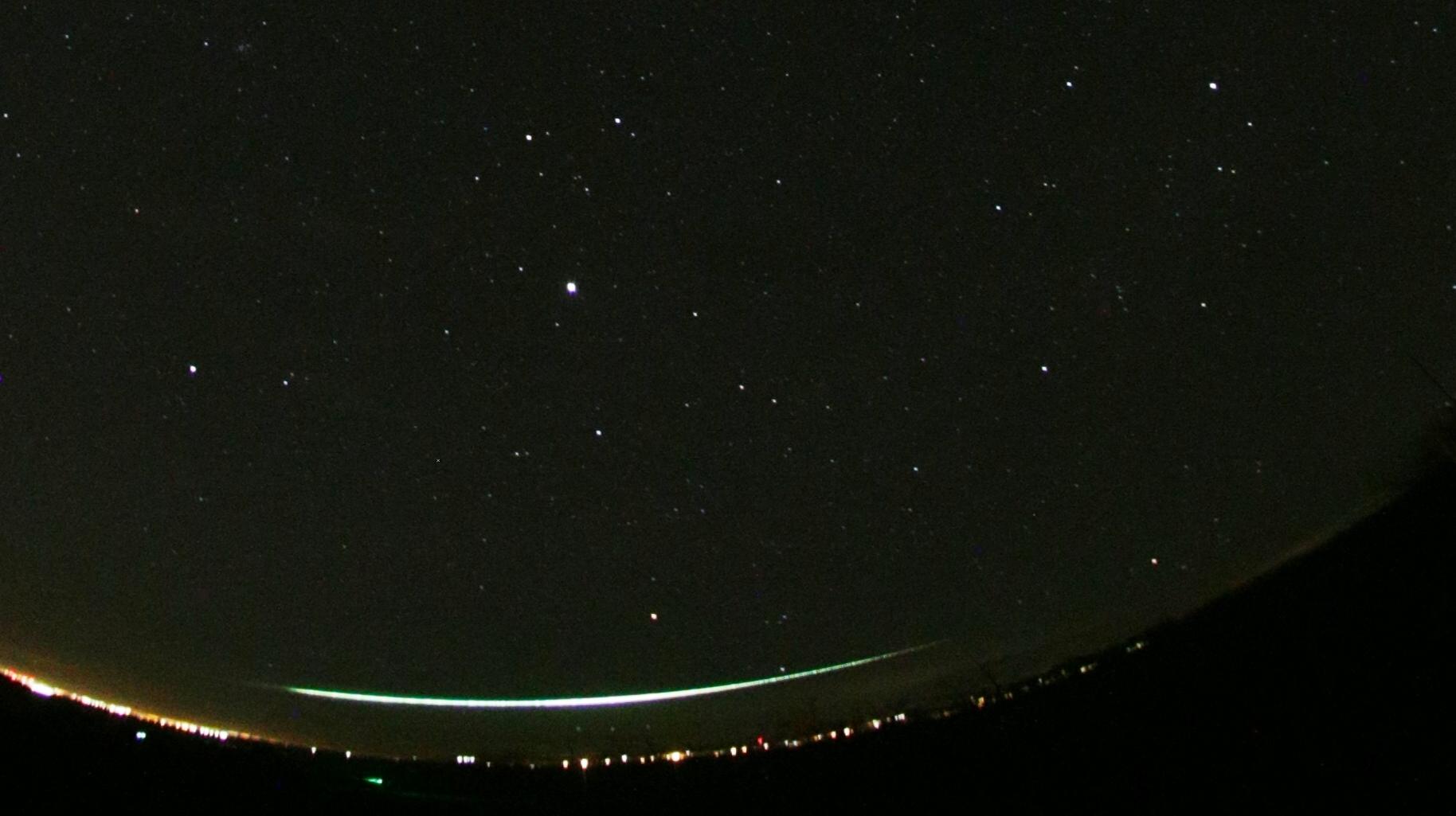 Uitsnede van de all-sky opname van EN120226_004140l , gemaakt door een automatische all-sky xcamera i8n Kuchařovice nabij Znojmo. Op de foto beweegt de vuurbol laag boven de westelijke horizon van links naar rechts van het sterrenbeeld Grote Hond door het ondergaande sterrenbeeld Orion naar het sterrenbeeld Stier (foto: Astronomisch Instituut van de Tsjechische Academie van Wetenschappen).