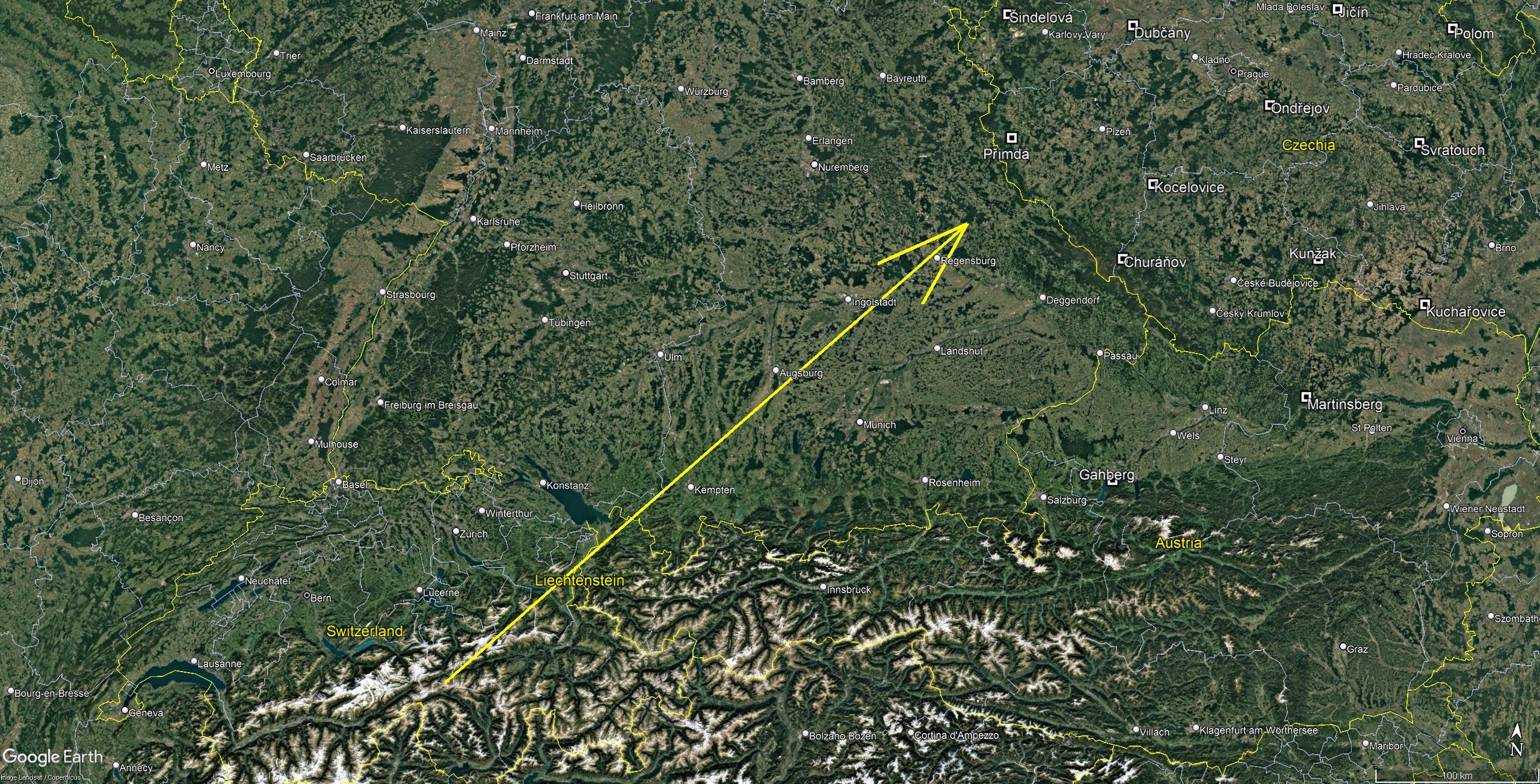 Berekeningen, rekening houdend met de hoogtewinden wijzen er op, dat kleine fragmenten tot 100 gram gevonden kunnen worden in een lange strook die zich uitstrekt van Neutraubling bij Regensburg via Roding tot Waldmünchen. Overgebleven grotere stukken konden zelfs naar Tsjechisch grondgebied zijn geschoten.