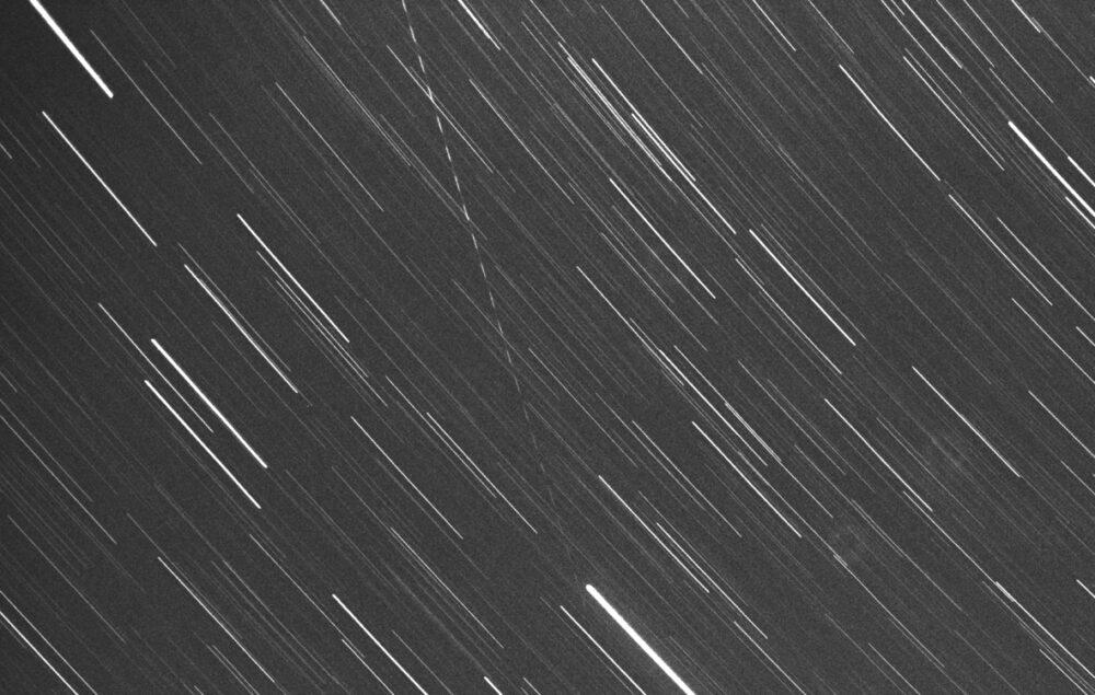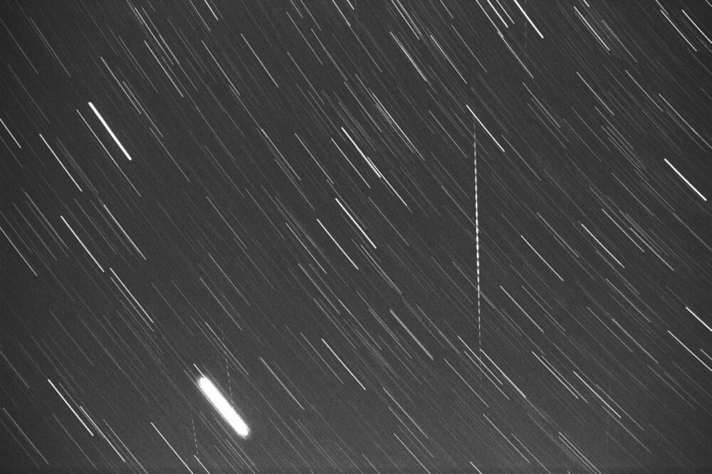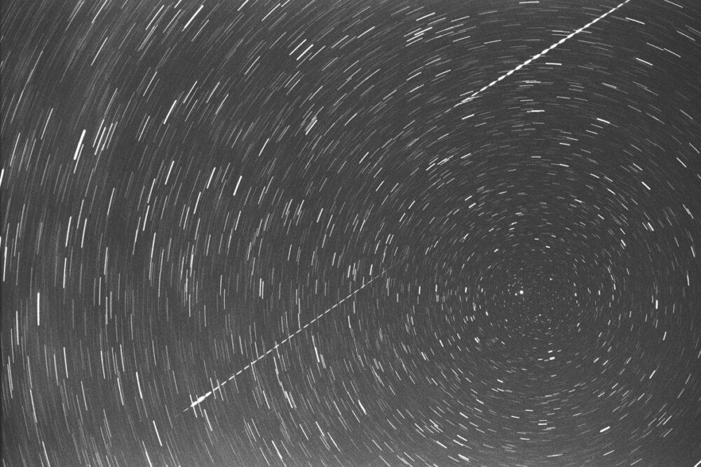 De Leonidenstorm in beeld. De helderste meteoor met een flare van magnitude -4 verscheen op 18 november 1999 om 2:22:13 UT. De originele negatieven tonen zes meteoren. Links Casa Nueva, rechts Punto Alto.